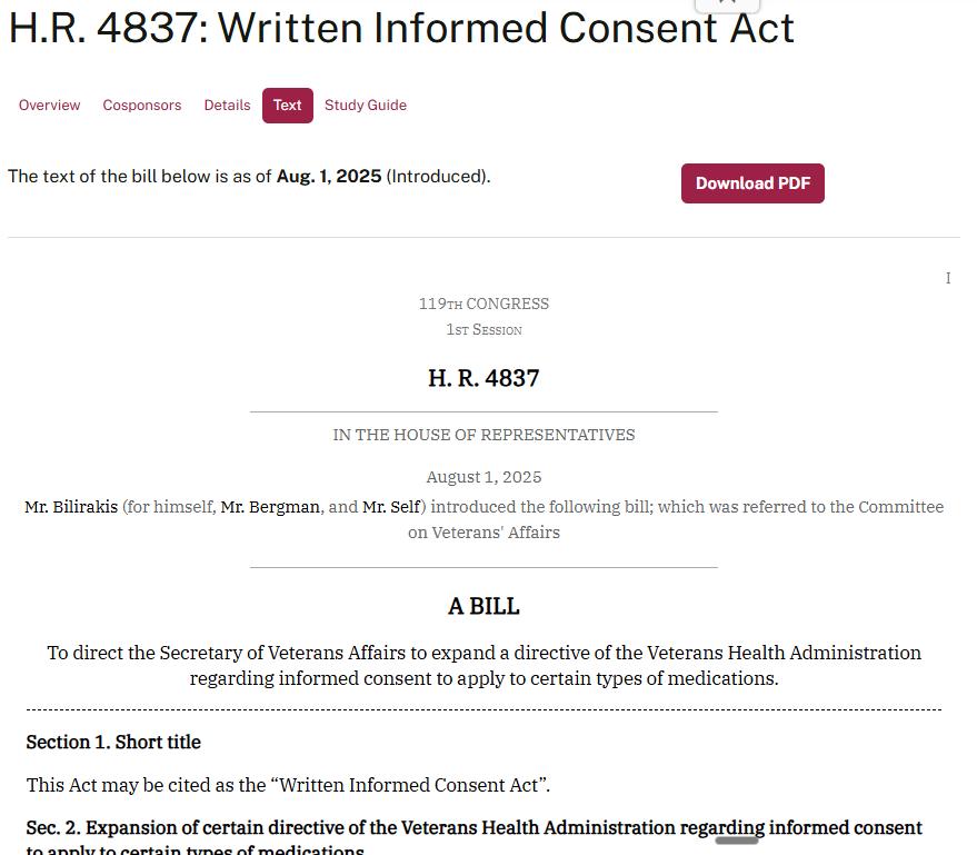 Your Bill, Veterans Informed Consent Act is a giant step in the right direction. A well-informed patient about the care, treatment, and medication they are prescribed will minimize if not eliminate side effects that will cause greater harm to them.
